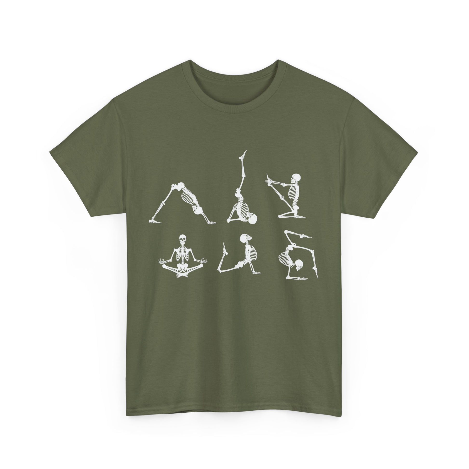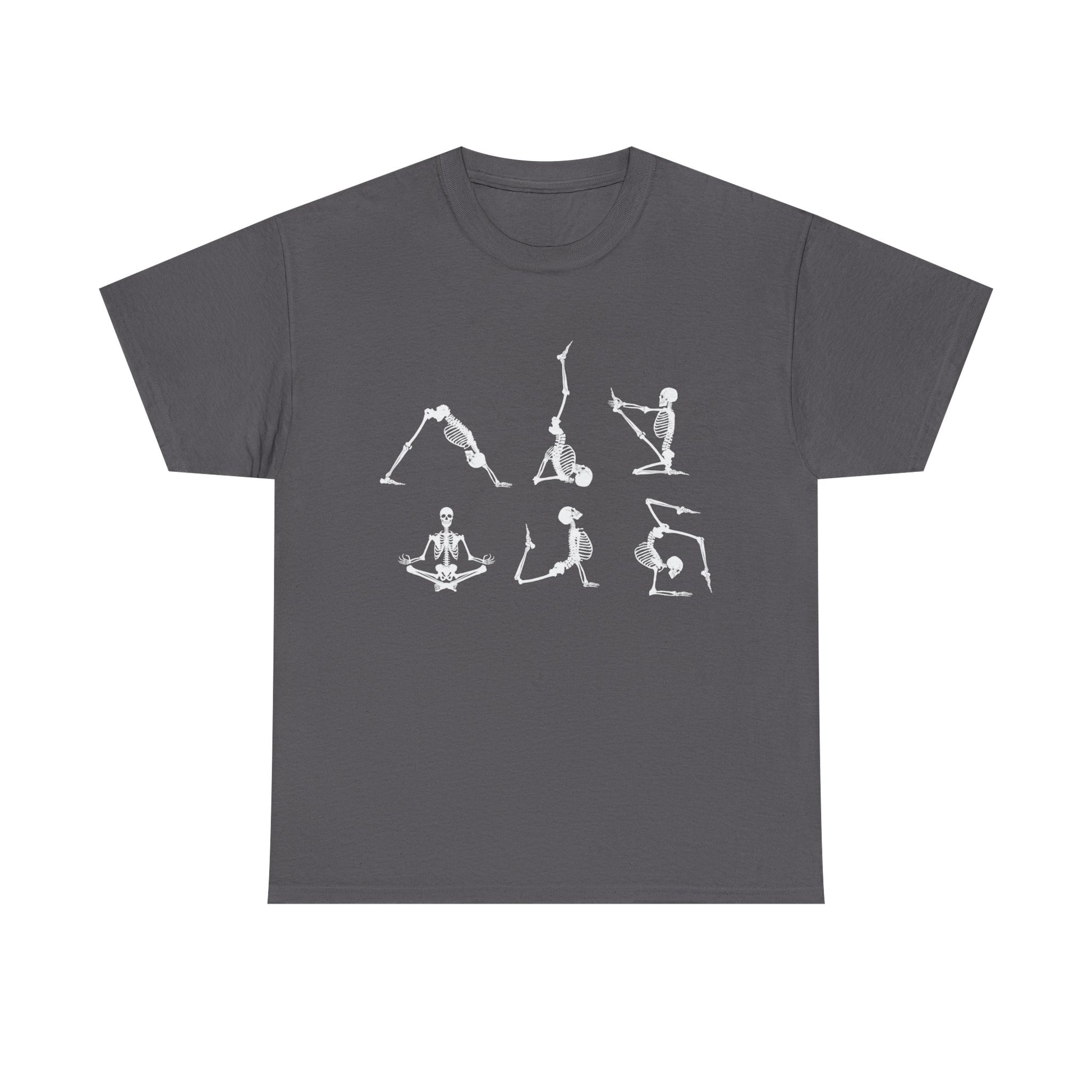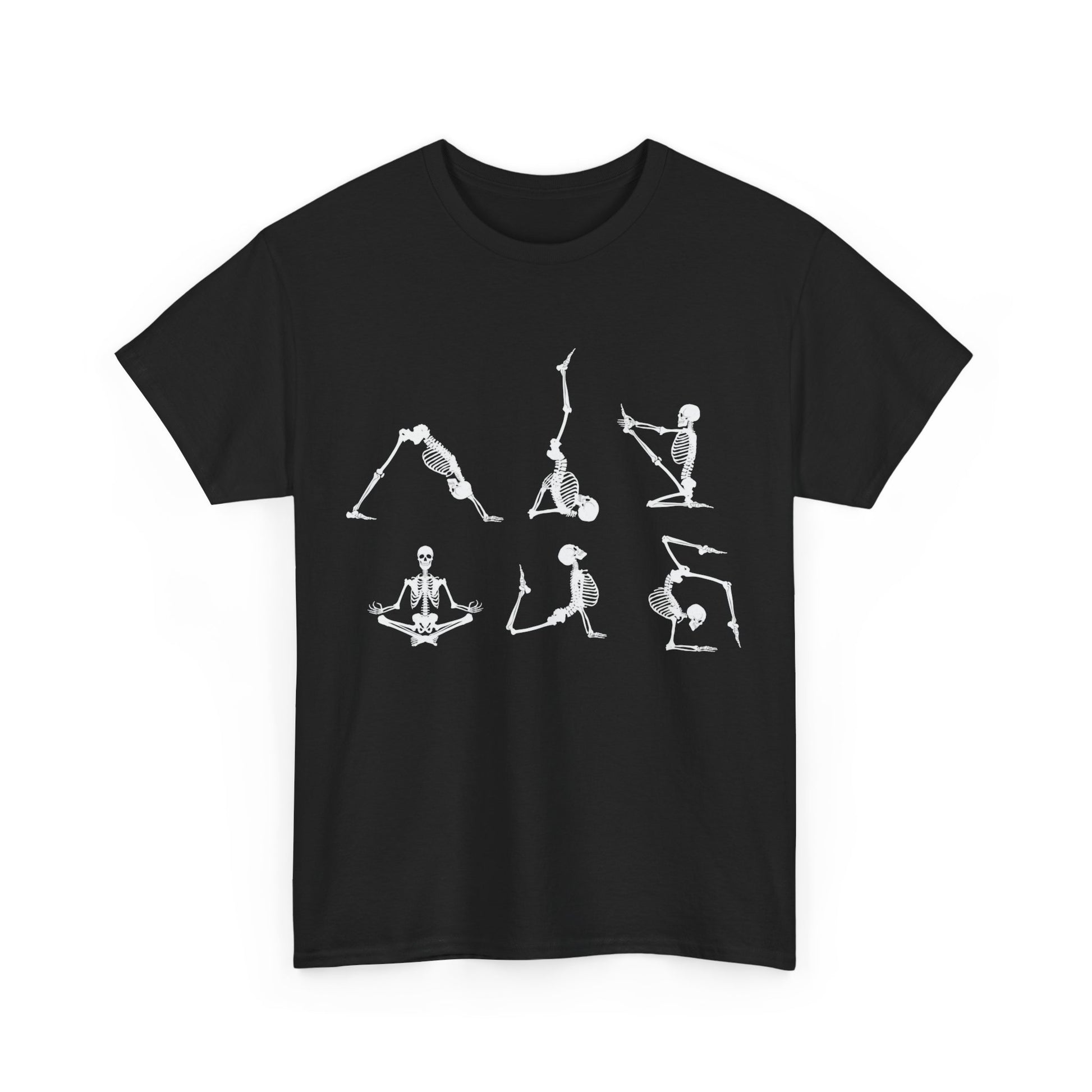 Nothing says HALLOWEEN stronger than yoga..errr.... Skeletons.... Whimsical shirt that is sure to get attention. The unisex heavy cotton tee is the basic staple of any wardrobe. It is the foundation upon which casual fashion grows. All it needs is a personalized design to elevate things to profitability. The specially spun fibers provide a smooth surface for premium printing vividity and sharpness. No side seams mean there are no itchy interruptions under the arms. The shoulders have tape for improved durability. .: 100% cotton (fiber content may vary for different colors) .: Medium fabric (5.3 oz/yd² (180 g/m²)) .: Classic fit .: Tear-away label .: Runs true to size
